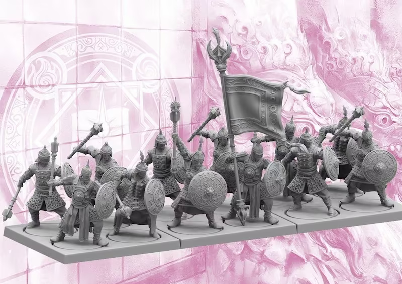 Well equipped, thoroughly trained and highly motivated, the Rajakur infantry are the backbone of the Enclaves’ military might. Clad from head to toe in heavy chain, bearing finely crafted shields and maces, the Rajakur infantry can be trusted to hold their ground against all comers. Their loyalty and professionalism are heavily rewarded, allowing veterans of two enlistments to move on to a wealthy land-owning retirement, a privilege reserved only for those who have served in the army.