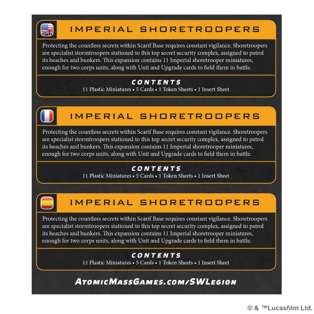 This expansion includes two Corps units, a Shoretrooper unit, and a Shoretrooper DF-90 Mortar Trooper unit which can be included using the Detachment keyword. This pack is a reissue of the previously released SWL41 Imperial Shoretroopers for Star WarsTM: Legion. This pack includes the same miniatures as SWL41 but updates the packaging and cards to the new SWQ multilingual format.