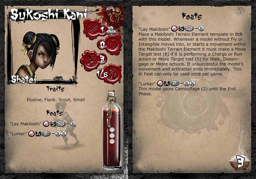 The oyabun of the Silvermoon do not consider age a restriction to the entrance to their service. Many fill their numbers with youngsters eager to establish themselves within the Shatei ranks and prove themselves worthy of their oyabun’s favour. All within the Silvermoon play to their own strengths, and in doing so strengthen their gumi. Sukoshi Kani and Nomi are no different in this respect. Sukoshi, armed with her bag of makibishi, ready to scatter them wide at a moment’s notice to cover a retreat or block a path. Nomi serves as the keen eyes and ears, ready to alert his brethren to approaching or unseen dangers. Their small statures another hindrance turned help, enabling them to sneak into an enemy’s flanks and wreak havoc.