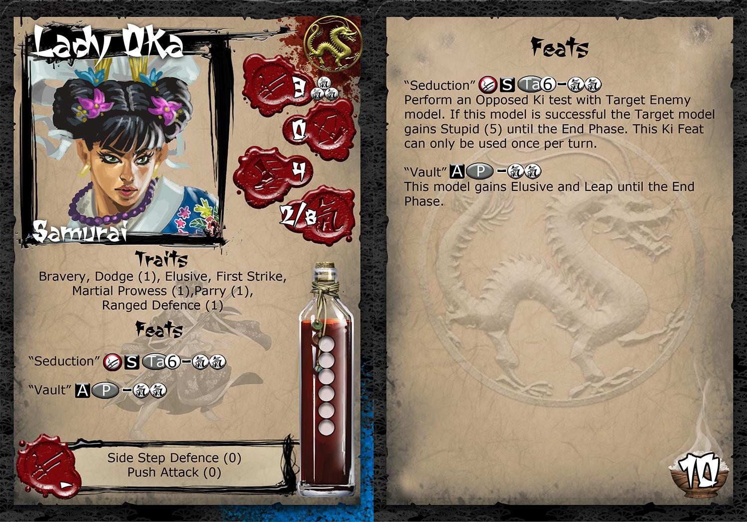 Lady Oka is as deadly as she is beautiful. Raised in the luxury of Ryu she is a great power in the court and has learned to use the weapons gifted to her just as expertly as those crafted of polished steel and lacquered wooded in the dojo. A nimble and dexterous warrior she wields the traditional weapon of a lady of the samurai caste, with a natural ease and elegance. She moves across the battlefield with the poise and grace of a dancer, avoiding blows and missiles as if they were not even there.