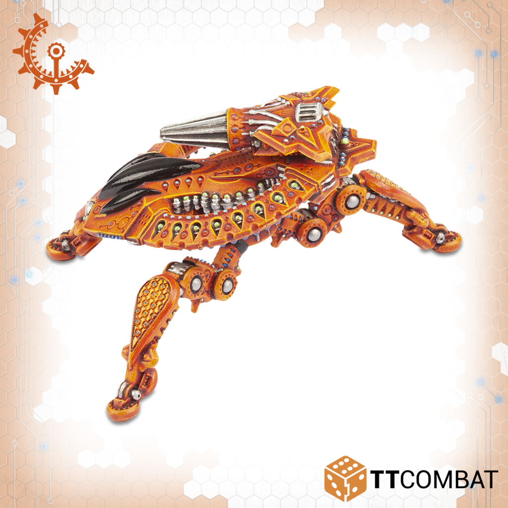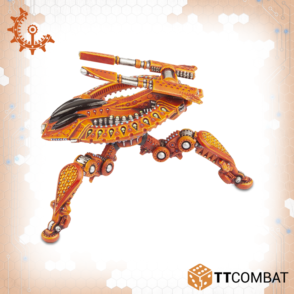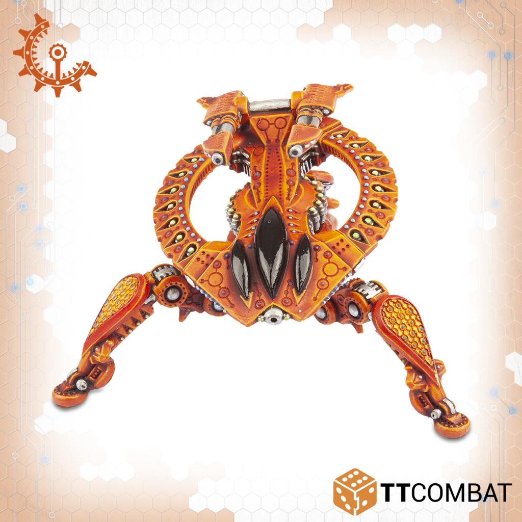 The Birdeater is an anti-air Battlestrider, armed with the familiar and lethal twin ion-cannon. It often employs its climbing abilities to gain a commanding view of the battlefield – a highly useful ability for an anti-air unit. Since it is less agile than the Kukri, it is better suited to more static defensive roles, where its superior survivability makes it a favourite of the Shaltari Warchiefs who favour heavier units.