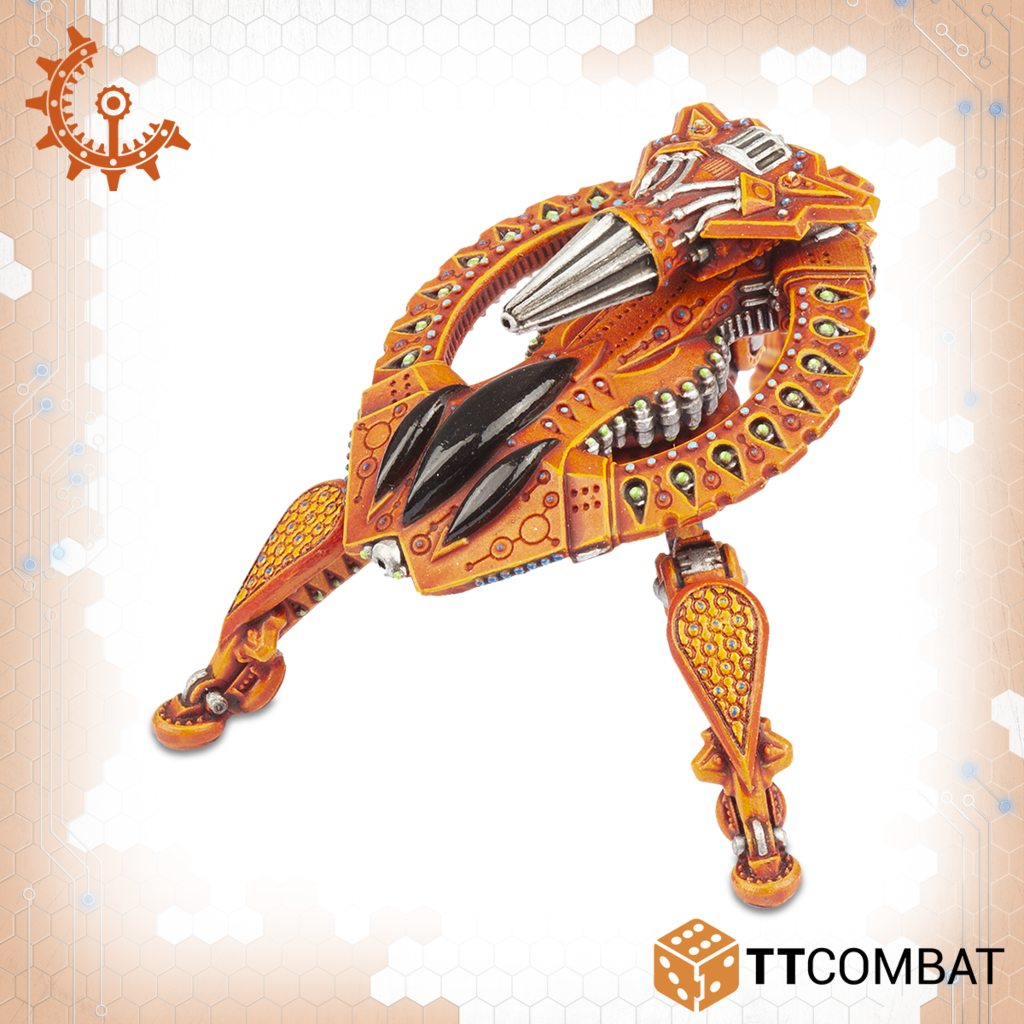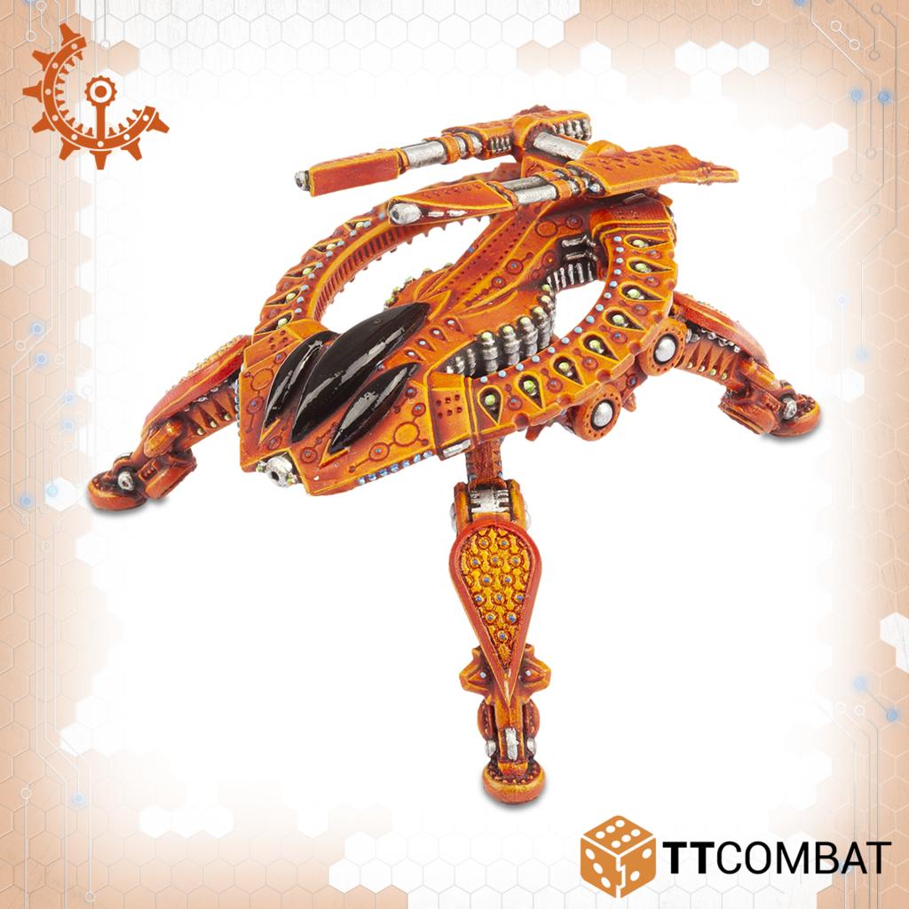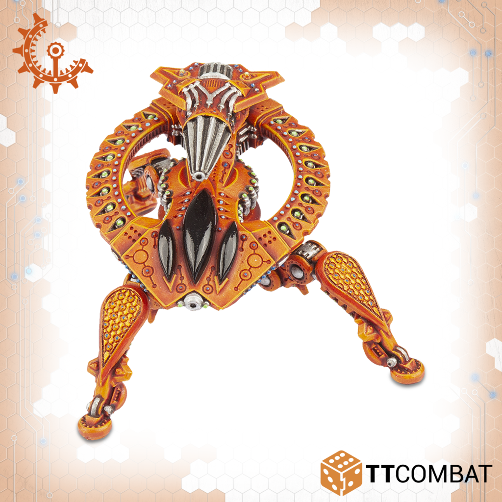The Birdeater is an anti-air Battlestrider, armed with the familiar and lethal twin ion-cannon. It often employs its climbing abilities to gain a commanding view of the battlefield – a highly useful ability for an anti-air unit. Since it is less agile than the Kukri, it is better suited to more static defensive roles, where its superior survivability makes it a favourite of the Shaltari Warchiefs who favour heavier units.