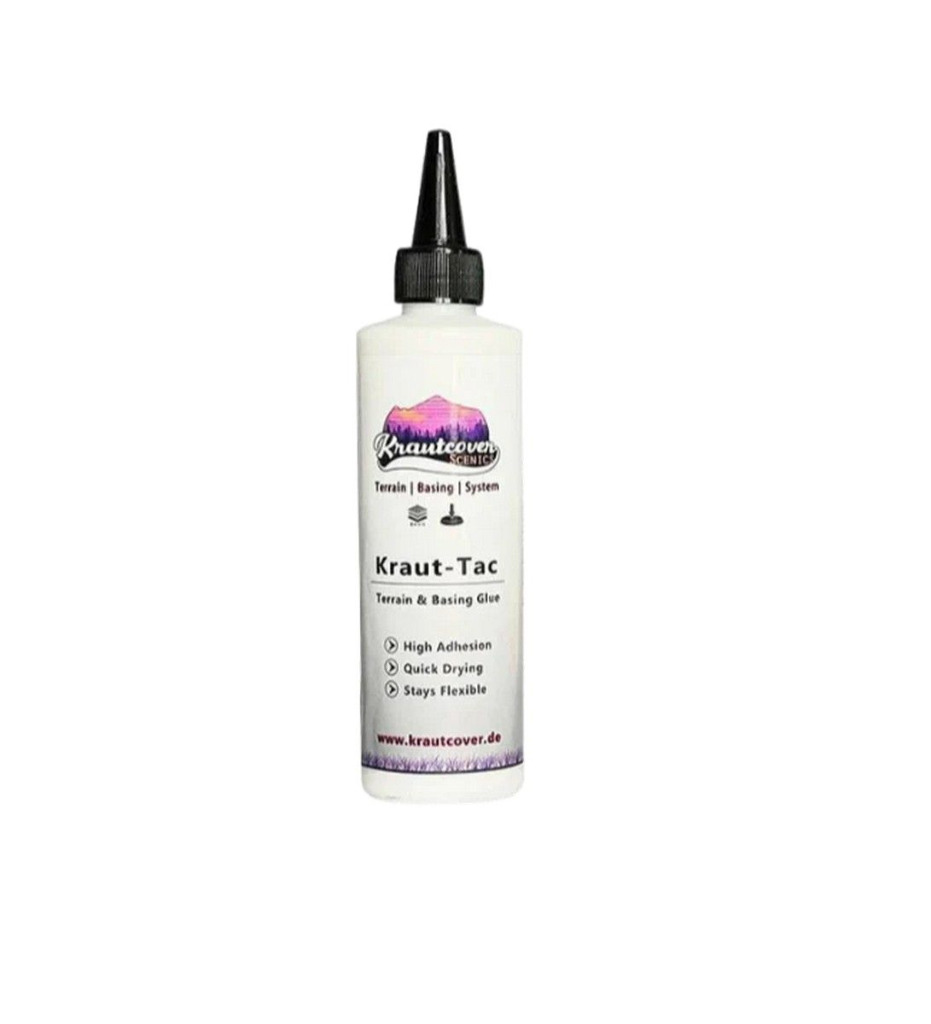 Terrain and Basing Glue is a fast drying extremely strong hobby glue with high initial tack. The highly flexible adhesive film remains permanently tacky even after drying and can later be set with clear varnish or diluted PVA glue. It is the first choice when it comes to fixing Krautcover’s base covers to your bases, but is also versatile for all your crafting projects. From making your own rollable playmats, to assembling MDF terrain to grassing or tufting, Kraut-Tac holds everything in place without flaking or crumbling. Allowing small drops of Kraut-Tac to dry on a sheet of plastic makes a very versatile adhesive dough, with which you can temporarily fix parts to minis, or create self-adhesive holders for painting your figures.