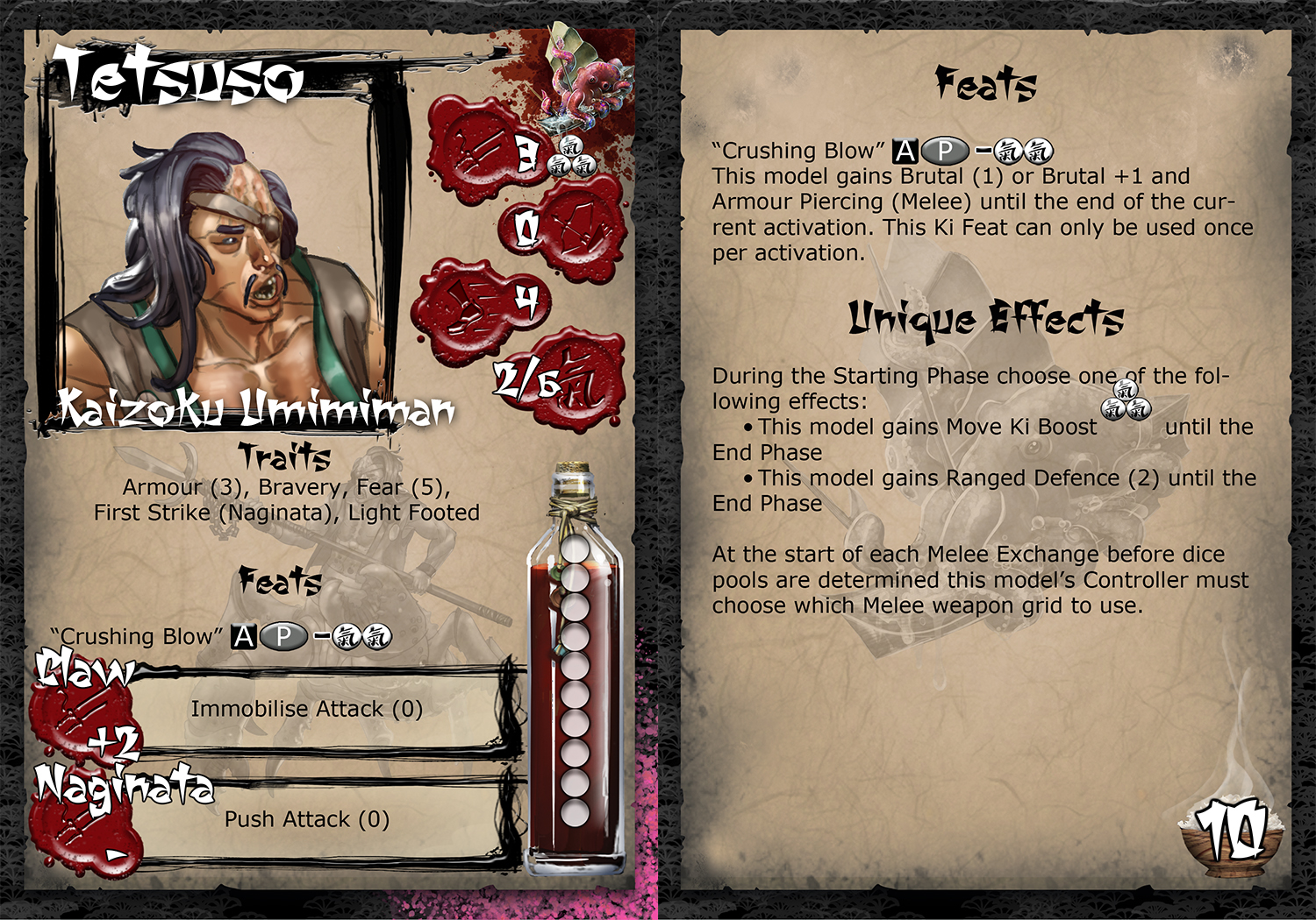 There comes a time after many cycles when a korusea has spent so long living a life on the waves that he starts to become more comfortable on the gentle rocking of a ship than the solid earth of land. Tetsuso has been touched by the Kami of the sea and turned into a monster of shell and claw, a formidable adversary capable of snapping bone and steel alike.