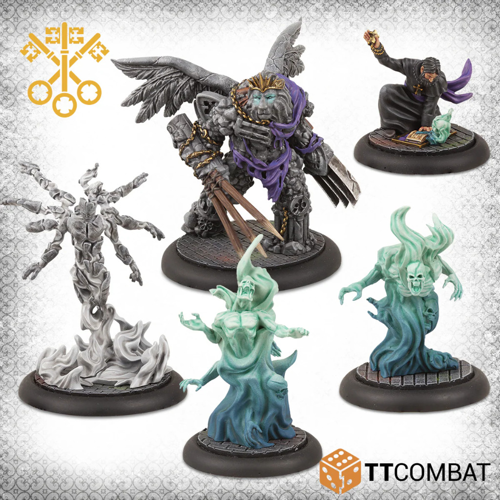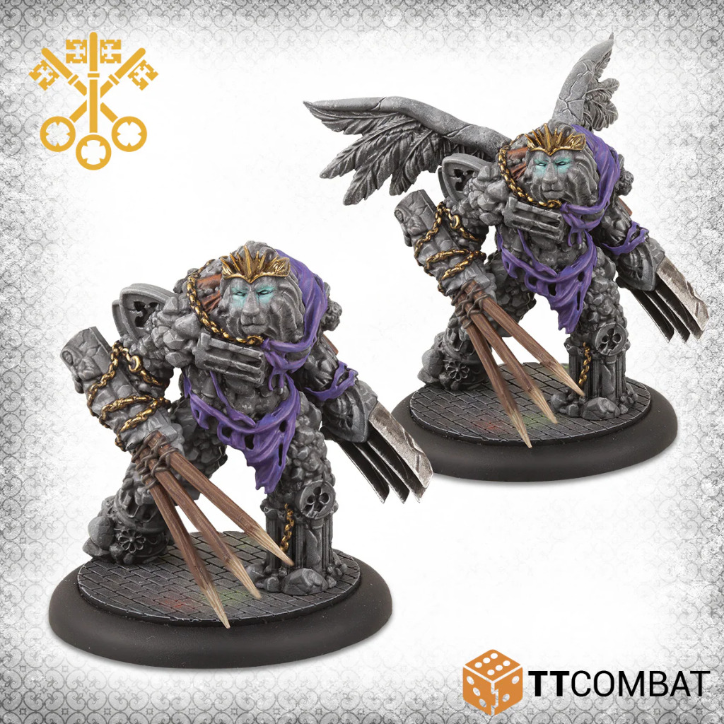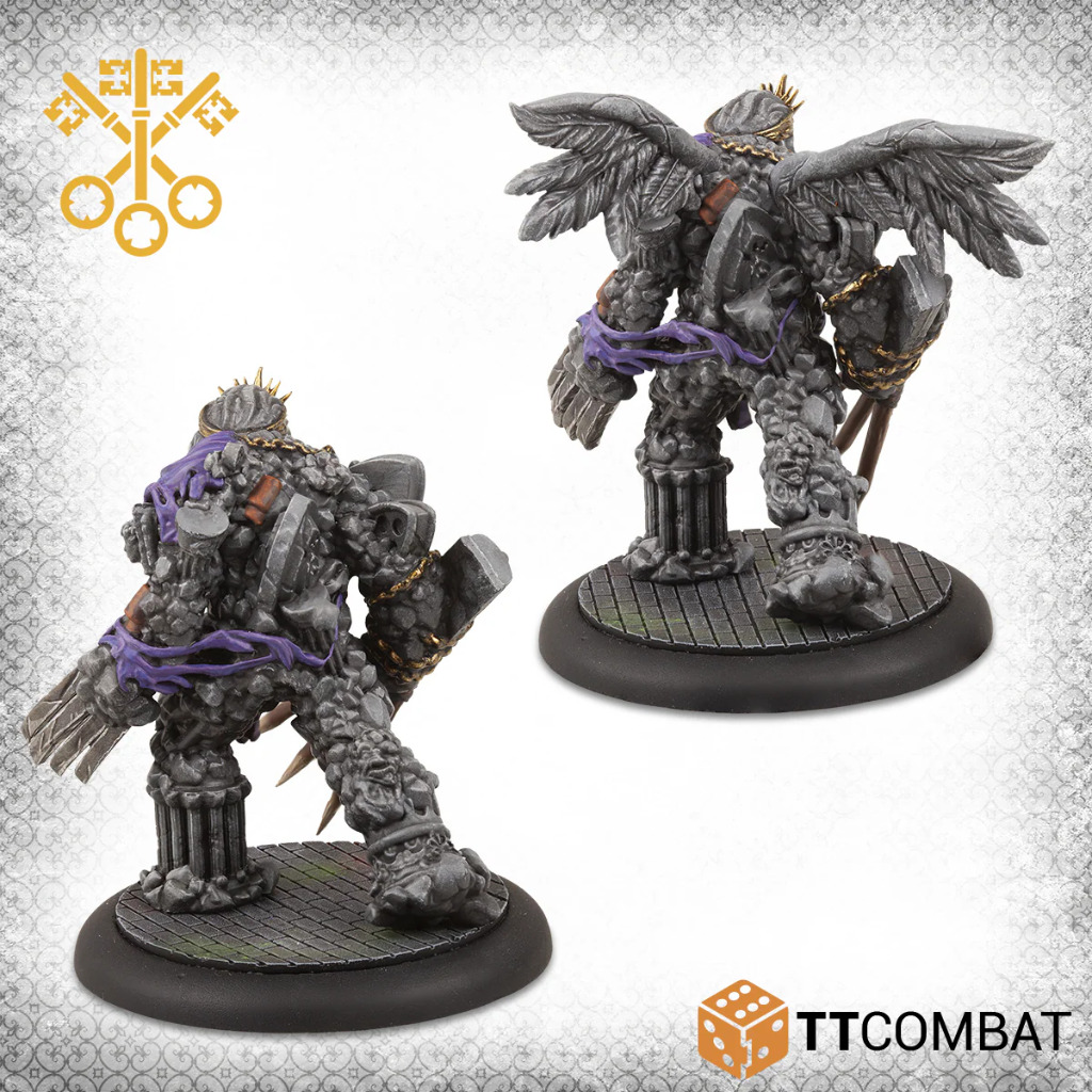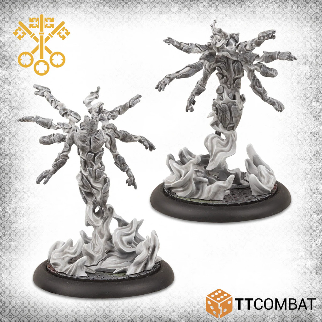 The Golgotha is a walking monolith, a veritable ton of marble and stone ready to bring its wrath down upon the unbelievers. Celestial Spirits are the souls of the dead, bound to the will of the Summoner Priests, they burn with spiritual fire and A desire to be released from their servitude.