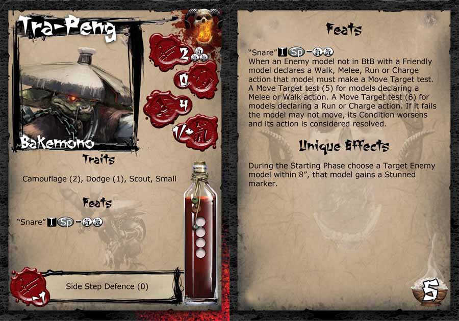 Tra-peng has distinguished himself from the horde of his brothers. Stronger, faster, more skilled, such attributes in a Bakemono are rare due to the jealousy invoked and the inevitable dagger found in one’s back. However the support Tra-peng receives from his bat companion combined with his own physical dominance has allowed him to attain an almost revered state amongst his peers.