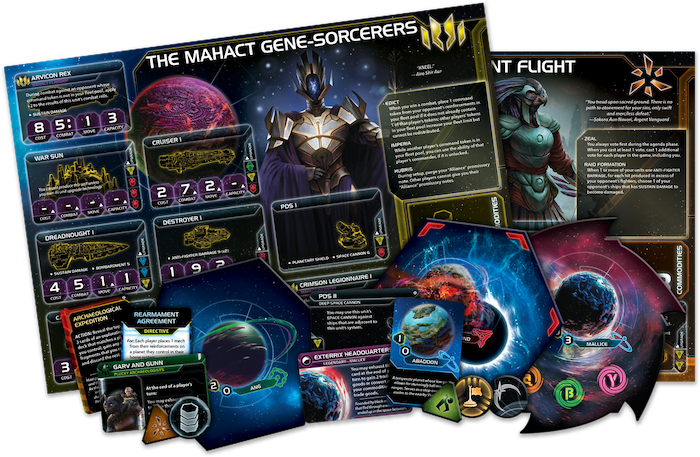 The massive Prophecy of Kings expansion is packed to bursting with new content that you can add to your games of Twilight Imperium. The galaxy has grown far larger, as seven never-before-seen factions enter the game, each boasting their own unique strengths and weaknesses, from the gene-altering powers of the Mahact, to the watchful guard of the Argent Flight, to the mysterious and ancient Empyrean. And new factions aren’t the only way the galaxy grows bigger! Forty new system and hyperlane tiles add new planets and obstacles to the map, and with two new colors of player components included in the box, you can play Twilight Imperium with up to eight players.