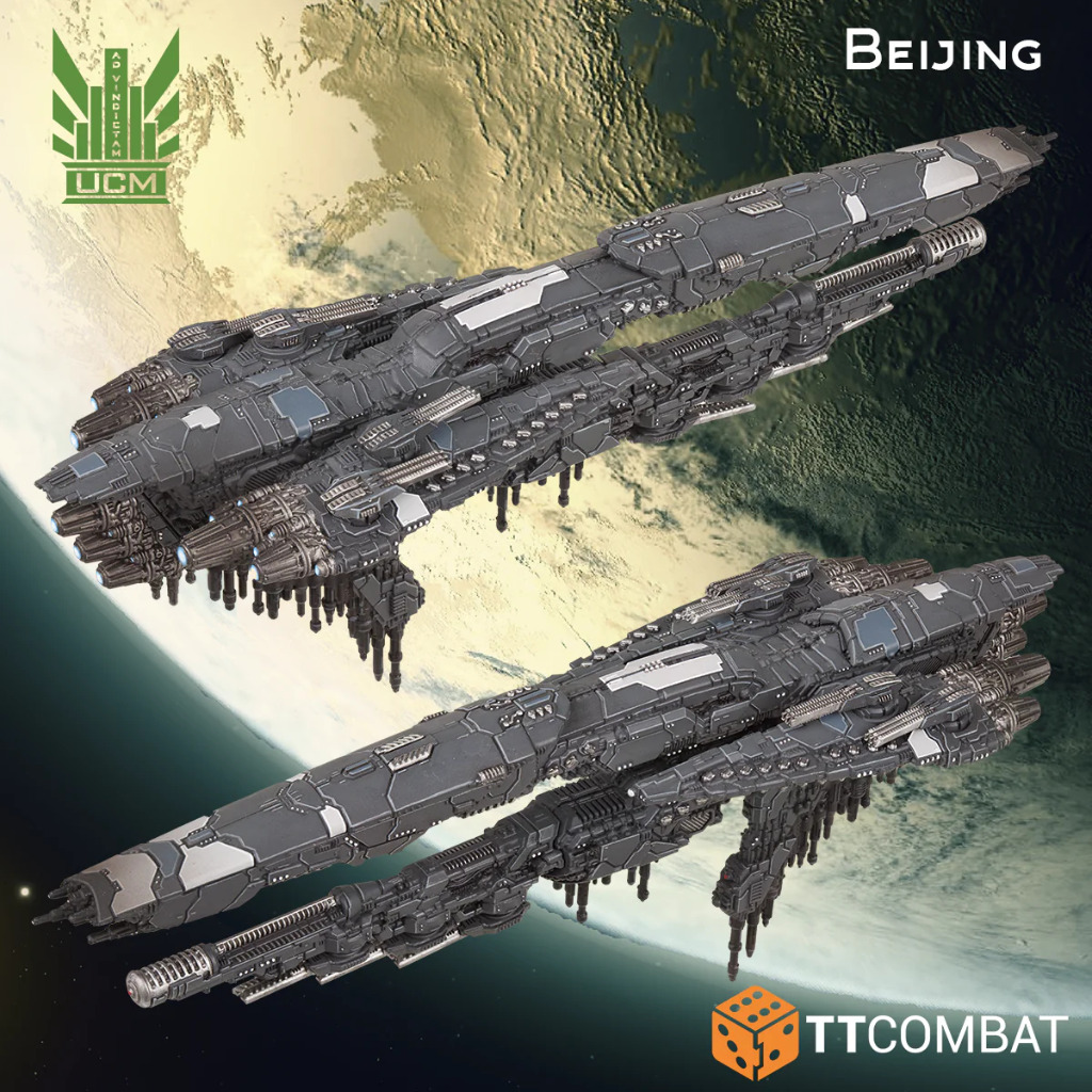 The Beijing class is an extremely resilient vessel which packs extensive firepower, namely nine UF-6400 mass drivers in three turrets, twelve UF-4200 mass drivers in four turrets and one Cobra laser, not to mention scores of missile bays and banks of point defence lasers. It is currently one of the most popular commands of the UCMF’s Admirals and for good reason – few ships the UCM has on active service are as effective in the annihilation of any enemy as the formidable Beijing. Most of the UCMF’s battleships are surrounded by tales of their illustrious deeds, their names etched into the collective consciousness of the colonial citizenry and this class has no shortage of legends.