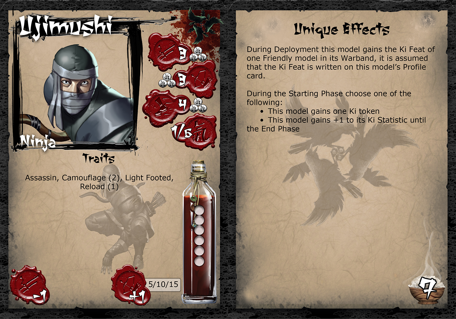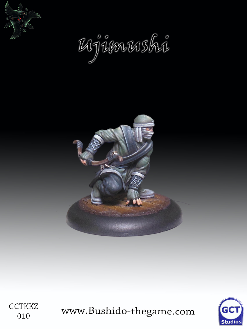 Like all novices of the Kage Kaze Zoku, Ujimushi is mercilessly and relentlessly drilled in the arts of the Kage. Although adept in all Zoku martial weapons he has chosen the short bow as his preferred weapon. On missions he strives to master the skills of the veteran ninja, the shadow crows, with whom he serves, mimicking and practising their movements to aid in his own training.