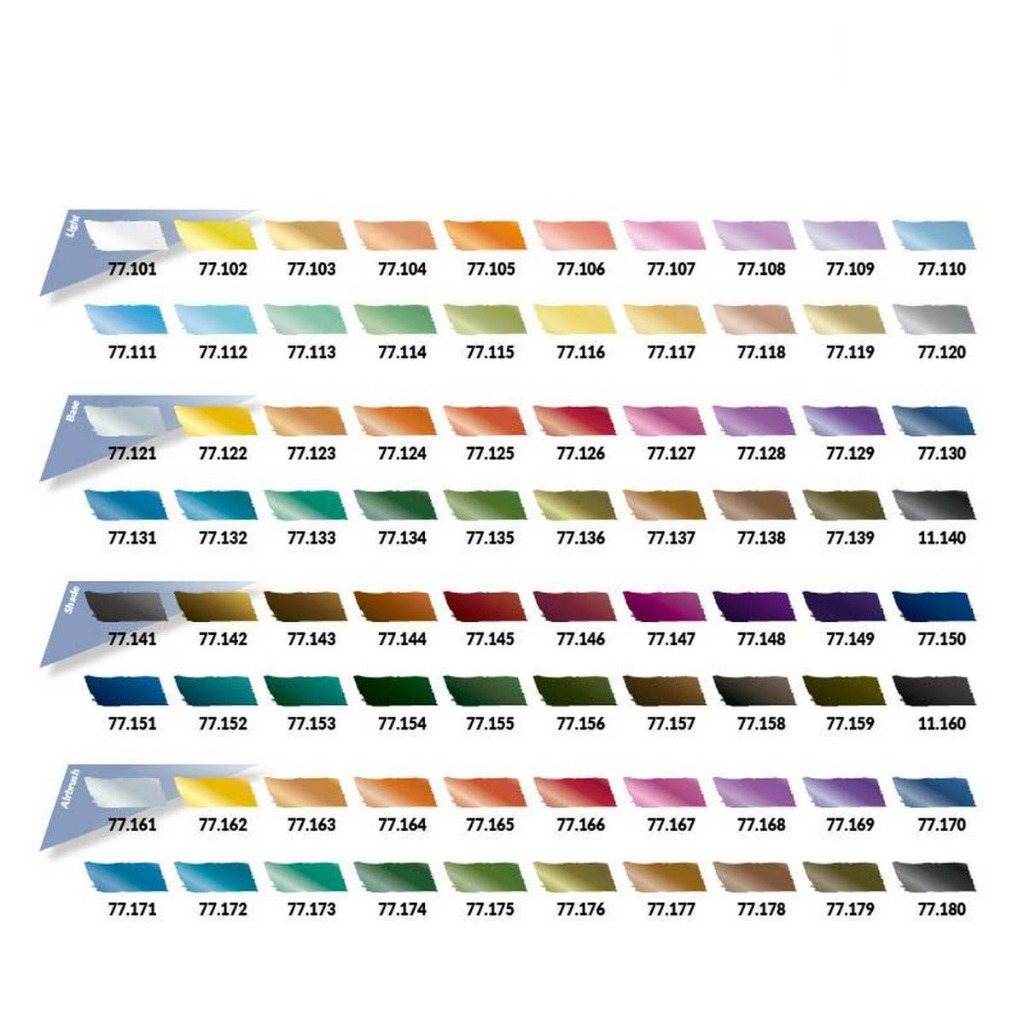 This case contains all 80 colors from the True Metallic Metal range, organized into 20 chromatic families, each with its corresponding Base, Shade, Light and Airbrush version – the complete BSL system applied to metal.