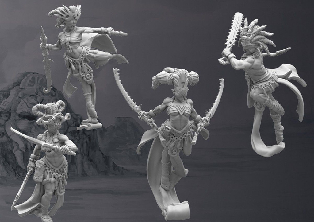 There are few warriors on any battlefield as terrifying as the chosen priestesses of Death. The deep meditative state they are capable of achieving allows them to elevate their hearing to truly superhuman levels, allowing them to “see” through sound giving them a preternatural advantage on the battlefield. They flow onto the battlefield with a deadly grace, their blindfolded forms weaving and covering one another in perfect synchronicity, the entire regiment fighting as a single organism. Entrusted by the tribes as midwives and healers, their medical training makes them deadly foes on the battlefield, their every blow precisely placed to cause the greatest harm possible, severing tendons, rupturing arteries and locking joints with pinpoint precision as they dance away from their foes’ clumsy blows.