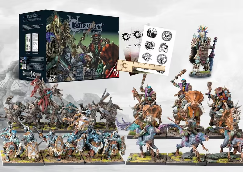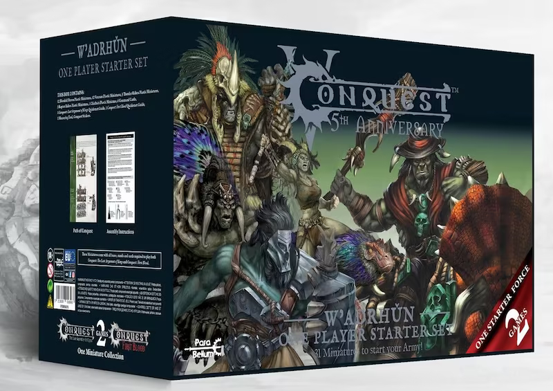 A supercharged 1 player starter ready to play a game of First Blood or The Last Argument of Kings. This W’adrhun set is loaded with a complete stand of 12 Blooded and Veterans, a set each of 3 Thunder Riders and Raptor Riders, plus the Chieftain character. Each starter set will have a well built First Blood army as well as a great beginning set to play a game of Last Argument of Kings. Included in this set are quick start guides for First Blood II and TLAOK II, along with all assembly instructions, a great path of Conquest guide, a 5th Anniversary Decal and Measuring Tool, an EA Paper Map and all necessary command cards, bases and stands. How do the W’adrhun play? W’adrhun are an elite, aggressive, army that must maintain an aggressive tempo and seize the initiative. Their unique War Chant mechanic allows each unit to chant a portion of a battlecry, growing in power as it reaches a crescendo, allowing the units that chant the Finale to receive significant bonuses to offense defense and mobility depending on which member of the pantheon the chant is dedicated to. While the W’adrhun pay for their elite infantry and vicious dinosaur cavalry dearly, the flexibility afforded to them by the War Chants allows them to cover ground fast, hit harder and last longer than their raw stats would seem to indicate as you push the attack and build up powerful abilities on your units at the same time. Coupled with the wide variety of monster the W’adrhun can field, this makes for a powerful offensive force.