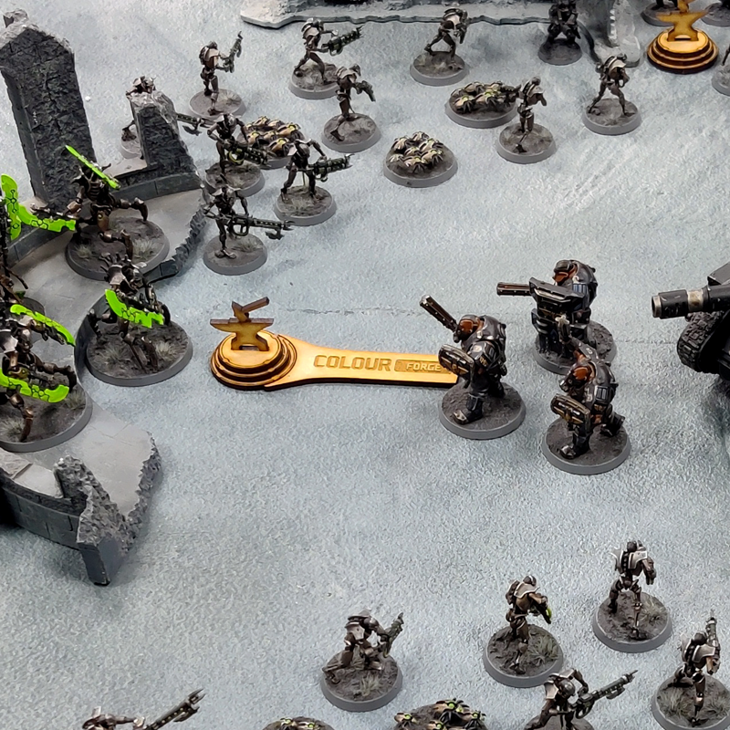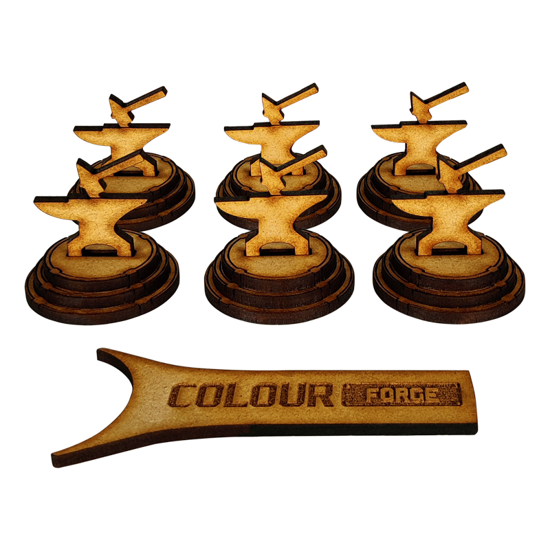 The Colour Forge objective marker set consists of 6 beautifully rendered 3D objective markers laser cut from 3mm MDF, perfect for use with 10th ed 40K (and a whole host of other game systems) These great objective markers are also accompanied by a measuring widget which works in tandem with the markers giving the gamer precise and relevant measurements every single time, meaning minimal downtime on the gaming table.