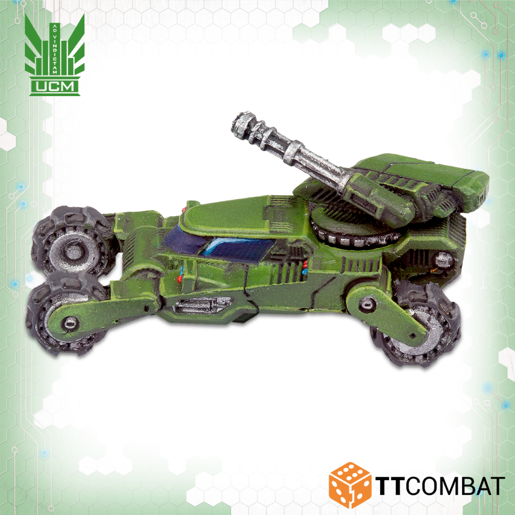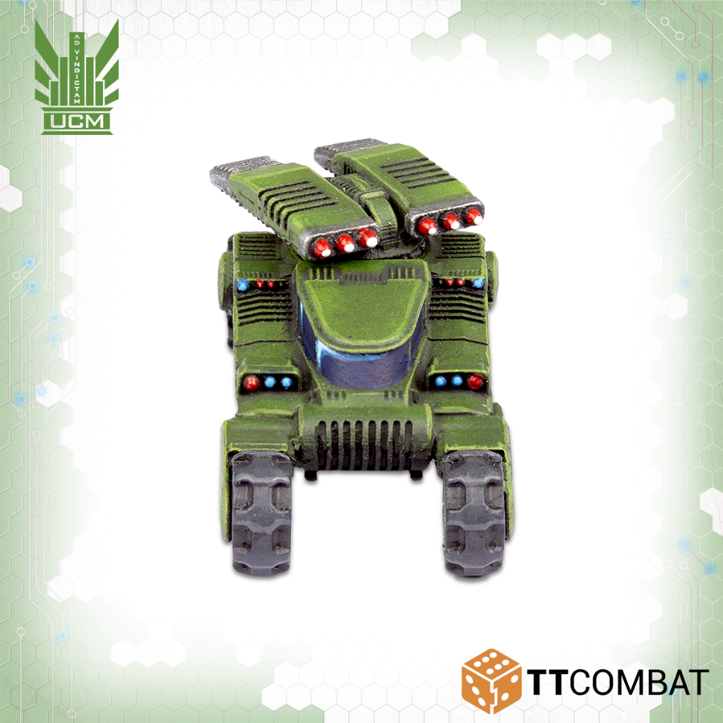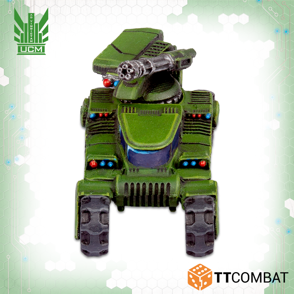 Watch out for the Wolverines! Although lightly armoured, they move incredibly fast. Their main role is providing extra Command Radius and drawing line of sight for the UCM’s many Indirect weapons. Although the Wolverine is no slouch in offensive firepower either! Armed with either a Missile Pod for anti-armour, a Minigun for anti-air, or a Light Flamethrower for anti-infantry, you can do a lot with this small frame!