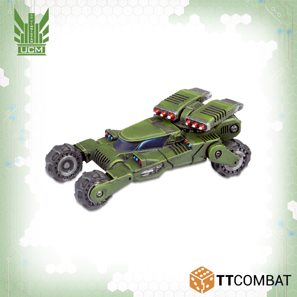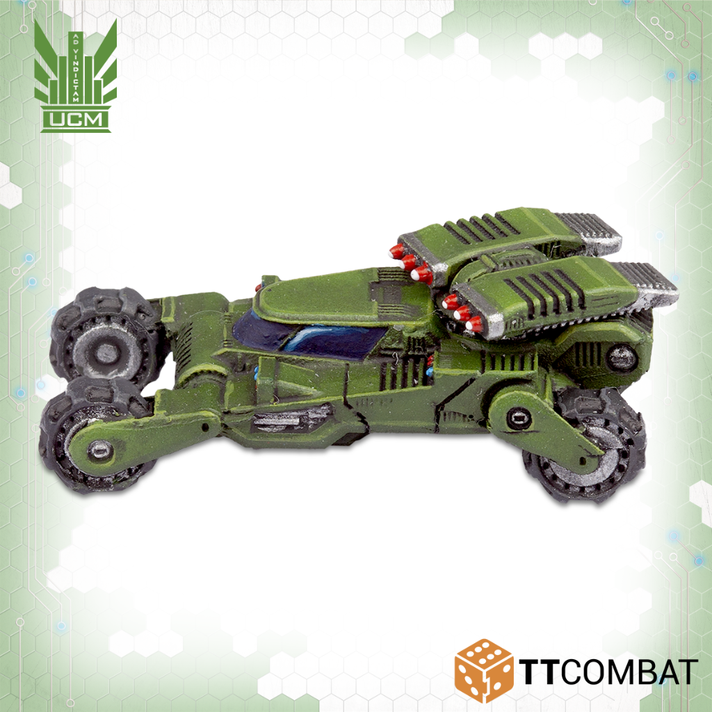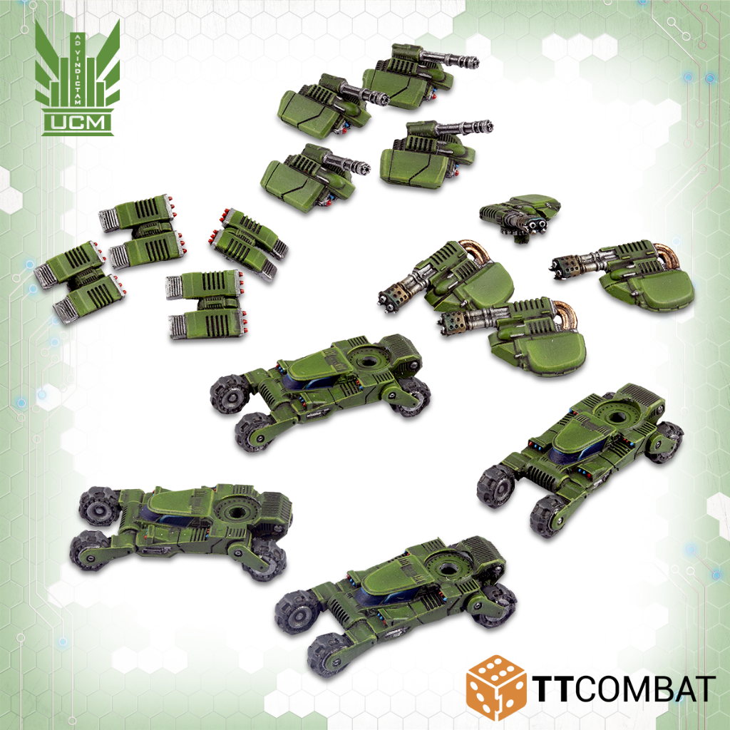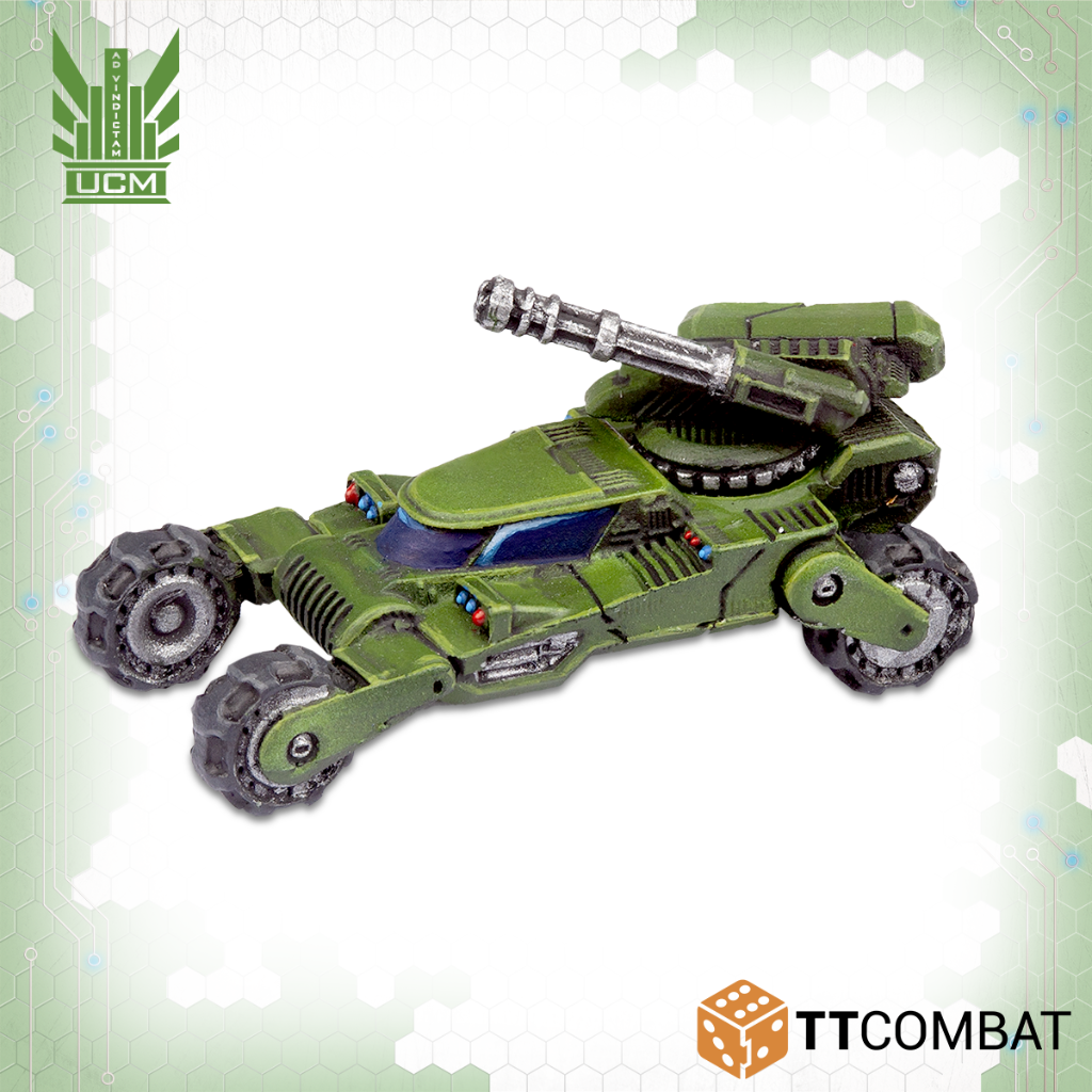 Watch out for the Wolverines! Although lightly armoured, they move incredibly fast. Their main role is providing extra Command Radius and drawing line of sight for the UCM’s many Indirect weapons. Although the Wolverine is no slouch in offensive firepower either! Armed with either a Missile Pod for anti-armour, a Minigun for anti-air, or a Light Flamethrower for anti-infantry, you can do a lot with this small frame!