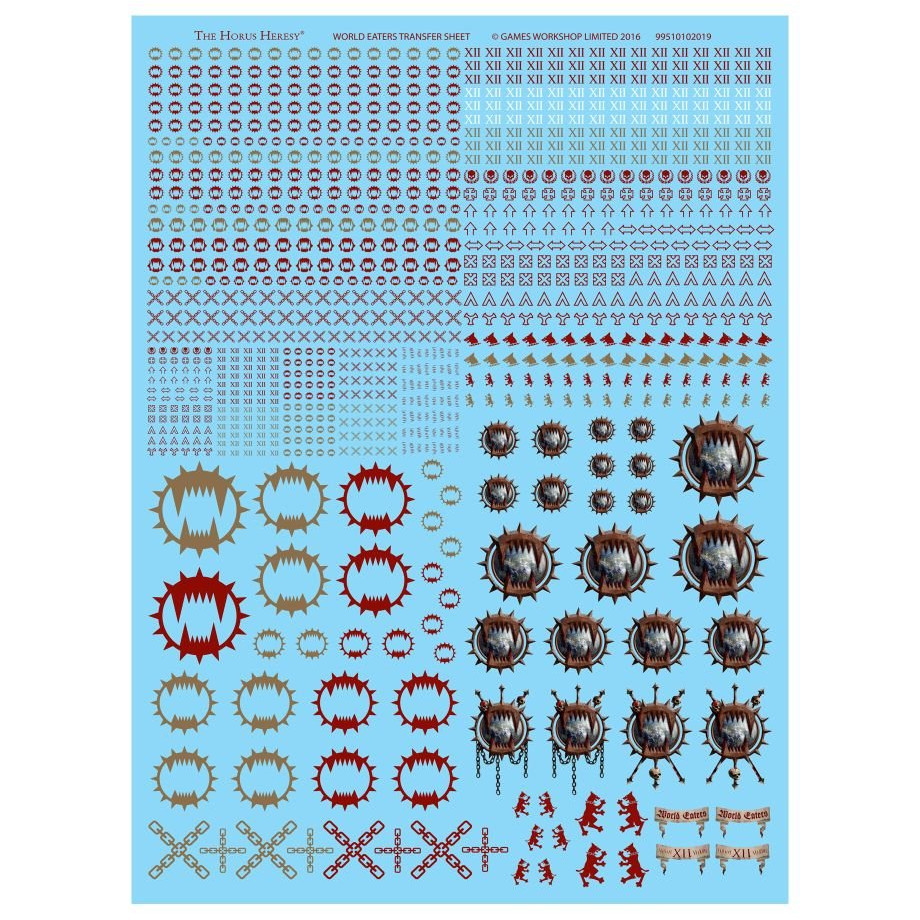 This A4-sized sheet contains 977 high-quality, full-colour waterslide transfers – more than enough for all but the largest Legiones Astartes forces. These transfers allow you to easily customise your miniatures with detailed imagery, specifically designed for the World Eaters Legion. The sheet features accurate Legion icons and numerals, company markings, and squad designations, as well as a variety of decorative insignias, honours, large vehicle badges, and banner art for your World Eaters army – including jagged kill-tallies, preserved War Hounds heraldry, and gladiatorial Nucerian symbols, such as the crossed chains that indicate the wearer has slain another Astartes in the fighting pits.