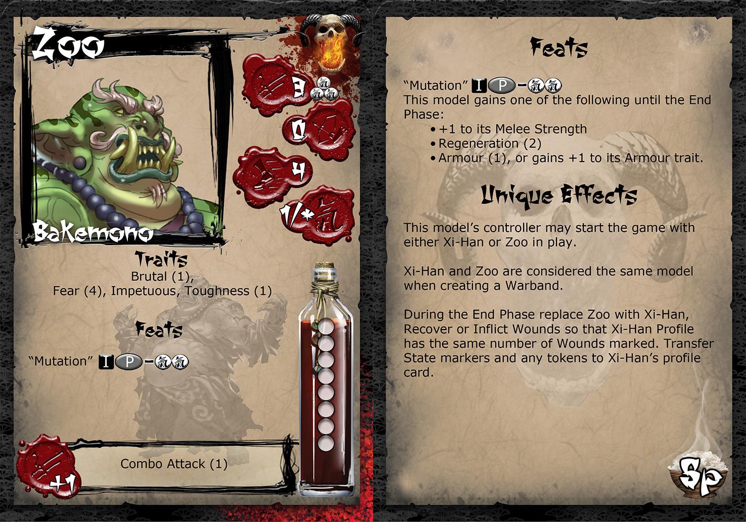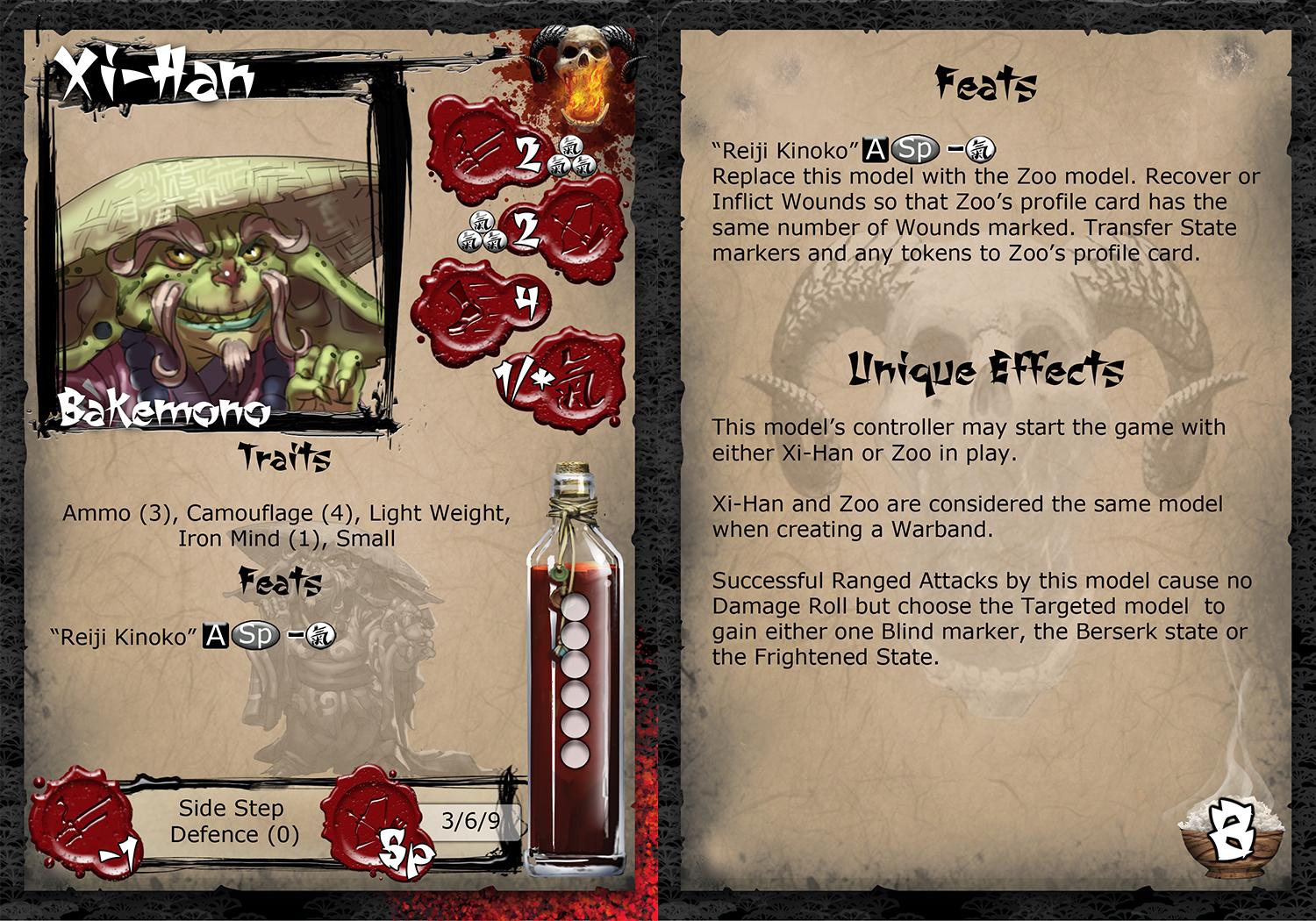 It is hard to tell if Xi-Han had lost his mind before or after he consumed every unusual mushroom he could find. The exact purpose of this pursuit remains a mystery. What is clear is that bizarrely he has managed to develop the ability to focus and force his body to replicate the effects of these rare and potent fungi. Sending his body into spasm and unleashing the deranged and violent “Zoo” for a short while to wreak havoc on his enemies. He also still maintains a constant supply of mushrooms on his person that he can throw in battle to Blind, Frighten or enrage anyone unlucky enough to inhale the spores.