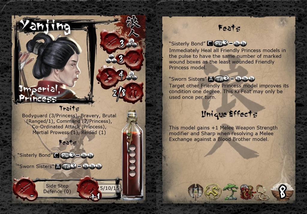 Yanjing is a formidable warrior in her own right. From a young age she had an affinity to the bow and her skills are impressive. Her calm zen archery produces impressive results, the arrows whispering across the battlefield as quietly as the falling blossom. Her ability to heal her sisters is of vital importance to their mission and without it they would have had to have given up on their quarry a long time ago.