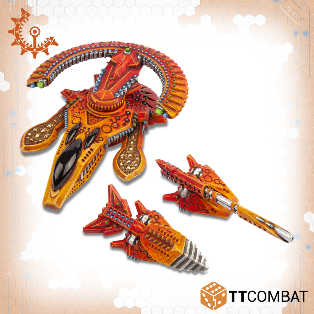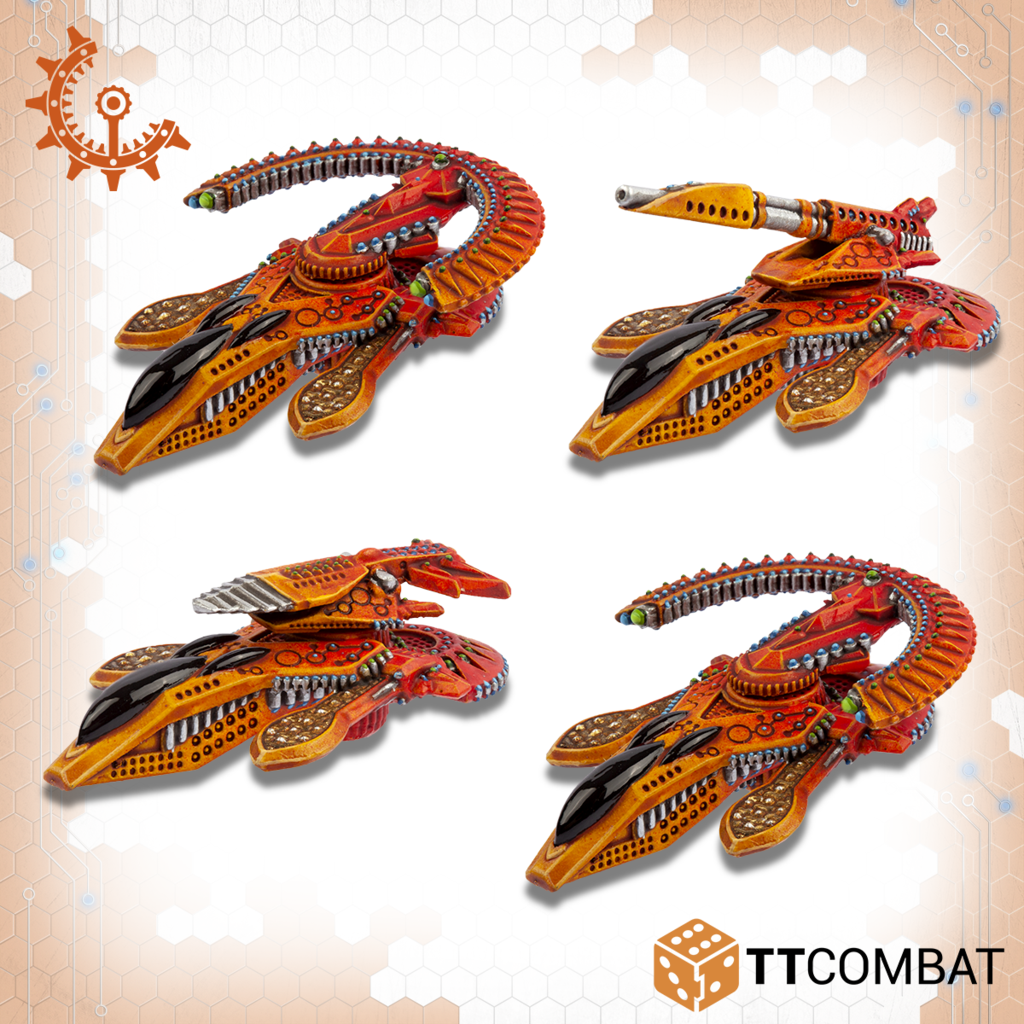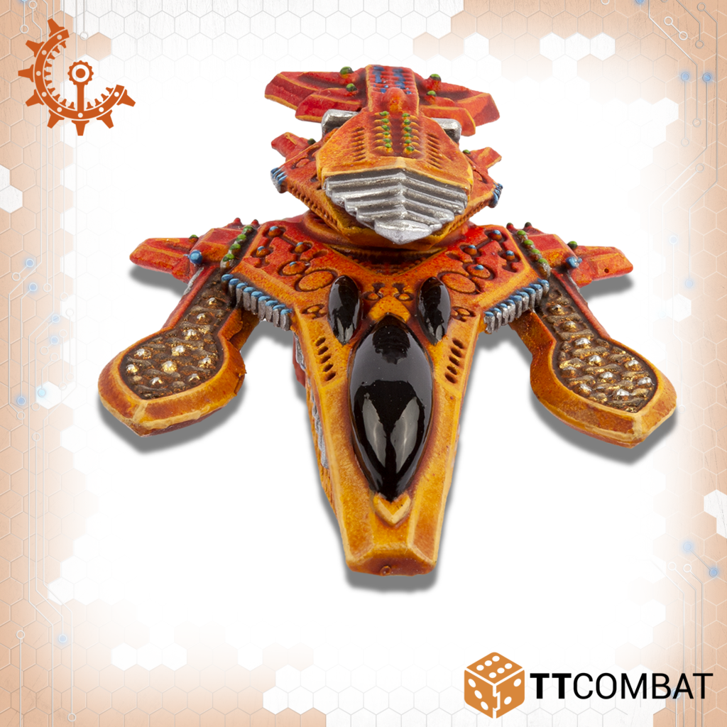 Contains four multi-part skimmers that can be assembled as either a squad of Yaris or a squad of Tates. 10mm in scale with a length of 31mm.