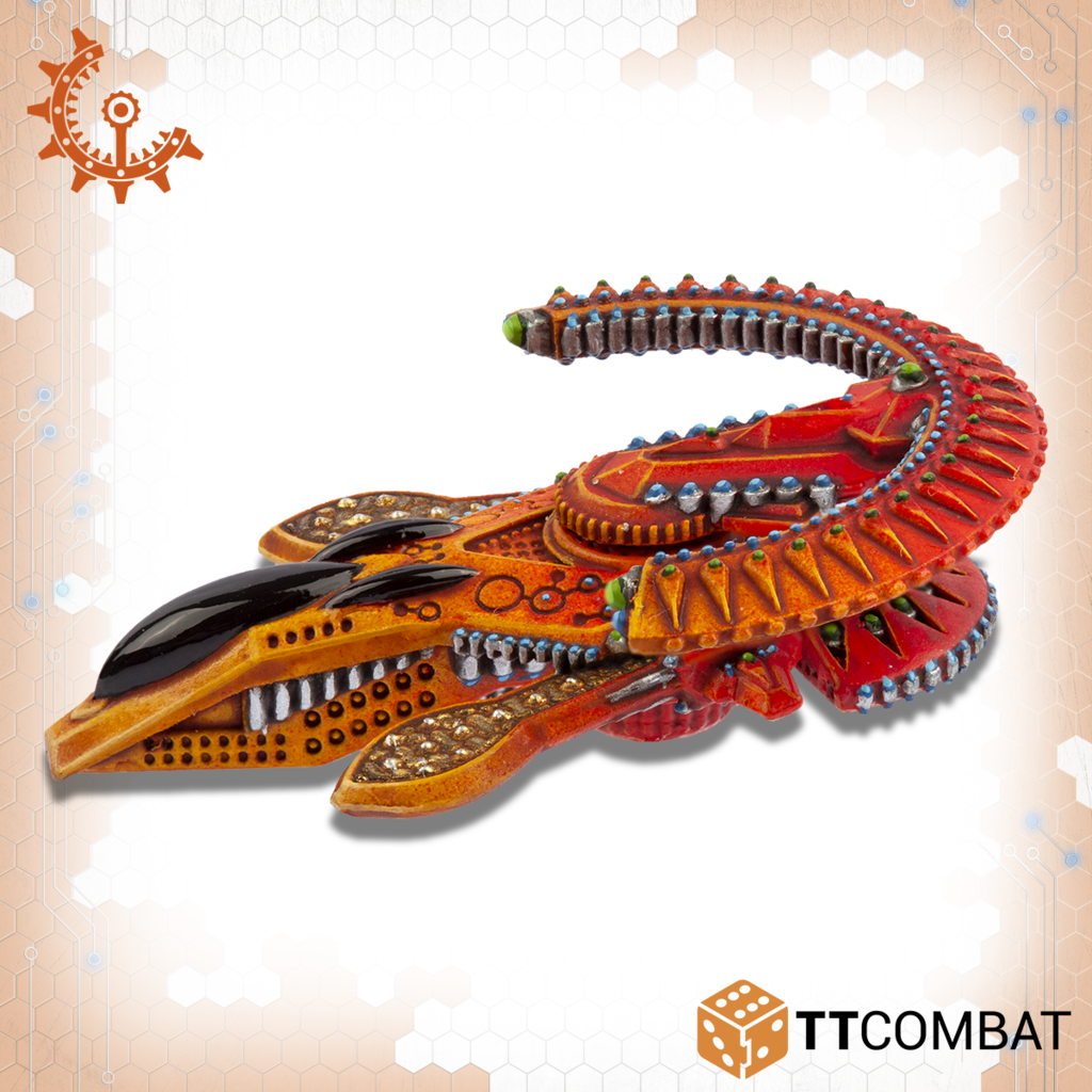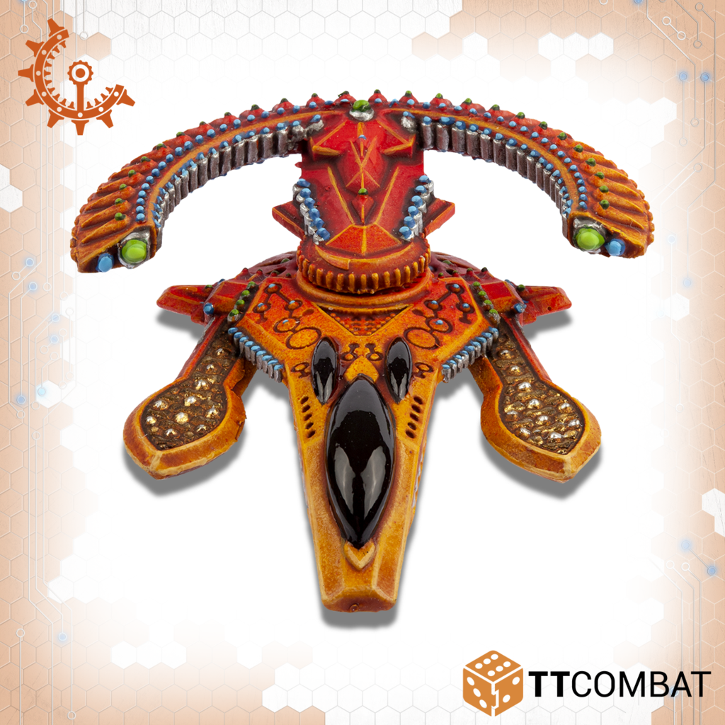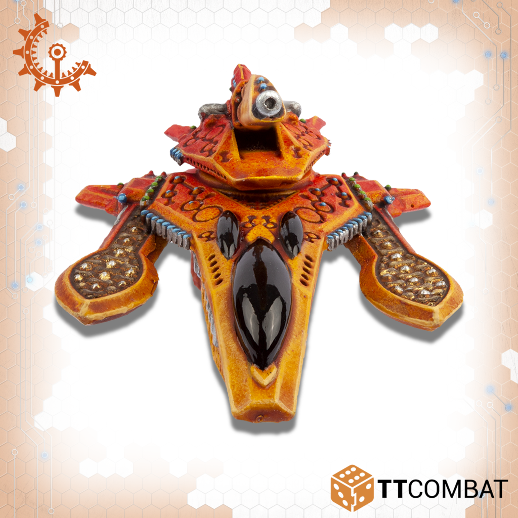 The Tate is a new development, at least as far as the UCM can tell for the Shaltari. Using the familiar Yari Chassis, the Tate swaps it’s weapon for a Shield Boosting Node. With it’s fast speed, this means it can deliver a shield booster to forces under attack, turning the tide of a firefight to the Shaltari’s favour.