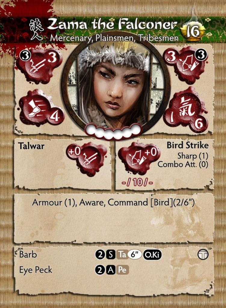 Zama is from a tribe living on the great plains north of the mainland. Once at war with the empire, her people now pay tribute to Emperor Song and hire themselves as mercenaries. Zama and her tribe had contact with Shiho Hiroto when he was travelling abroad, and in a story for another time, they became bound to him with ties of blood and honour. She and a handful of her ilk are now in Jwar, ready to repay that debt. Having power and understanding over her fearsome eagles, she is an ally to the Tengu, who she reveres and knows from her past. Zama is a peerless falconer; she directs her birds while she remains safe. When faced with larger prey, eagles attack the eyes, offering advantages for other assailants to finish them off. As a hunter, she also uses traps and snares. Zama can run them down if she snares an opponent with a barbed line.