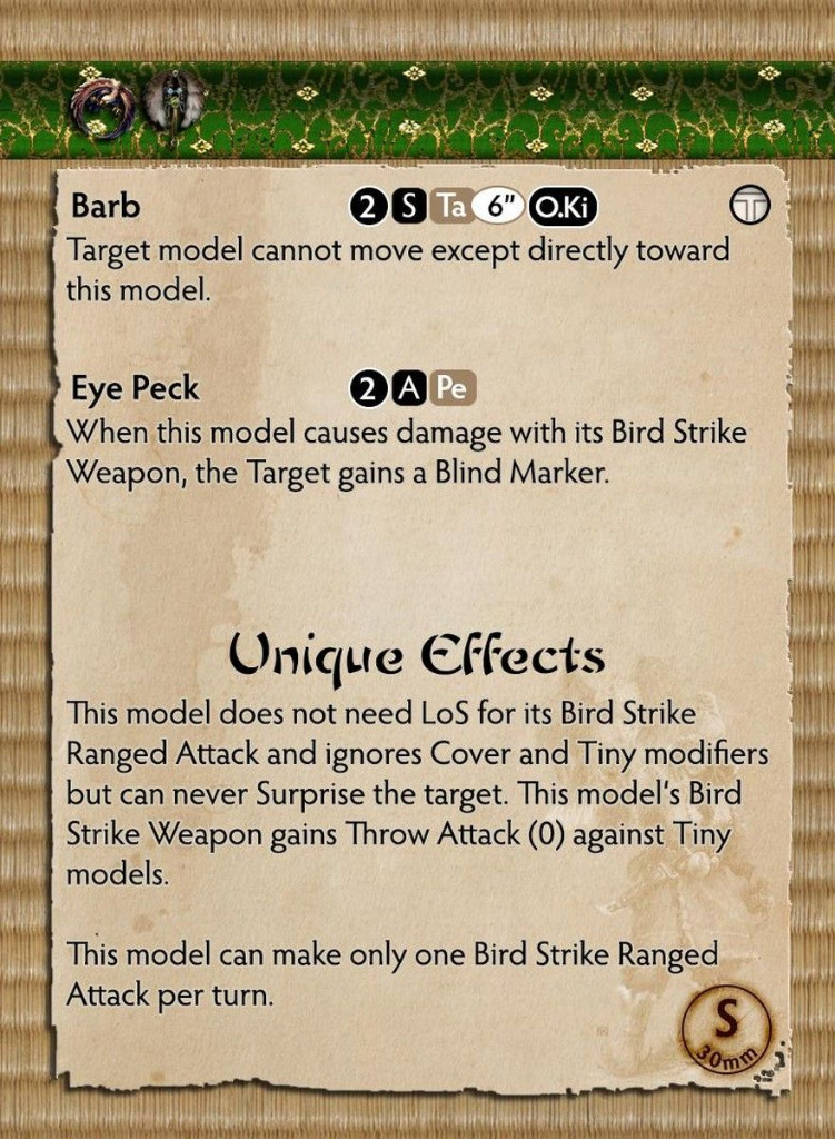In the game, Zama uses ranged attacks which do not need LoS. Using the Eye Peck Ki Feat can inflict the Blind State, an effective way to combat many enemy models. Her Barb Ki Feat is an excellent control element that can manipulate the battle by correctly controlling enemy movement. Zama is a Ronin model available to Shiho and Descension warbands.