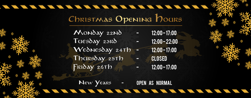 We’re just closed on Christmas day, with some early closes in the surrounding days, so just be aware if you’re planning gaming days out during your time off over the festive period!
